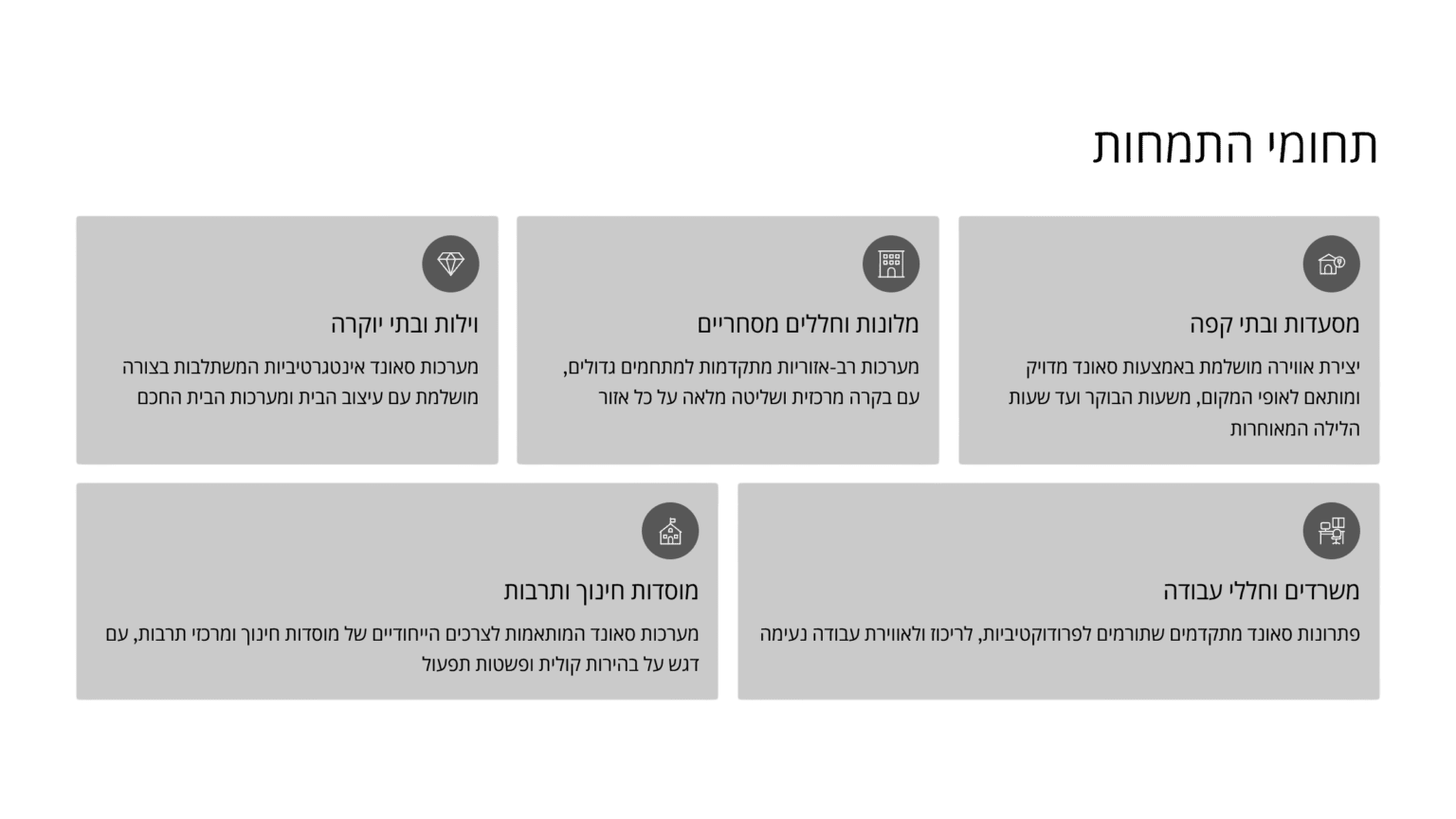 בין אם מדובר בסאונד רקע לוילה פרטית, או במערכת רב-אזורית מתקדמת למתחמים, מלונות או מתחי מסחר – אנו דואגים שכל צליל יישמע בדיוק כפי שתוכנן.